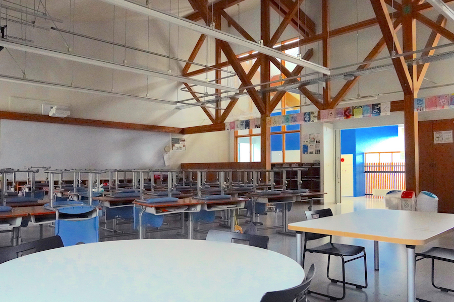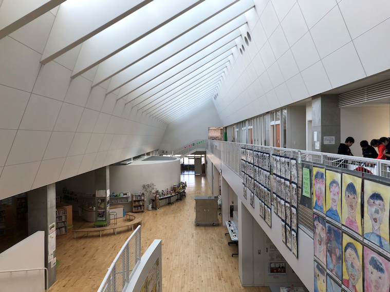 7,200mmの架構でつくられた過不足のないジャストなスケールが寒冷地である北海道の建築に相応しく、加えて小学校という教室の反復で構成されるビルディングタイプを成立させる上でも重要な働きをしている。ただ、明快なグリッドでつくられたこの建物には、唯一と言って良い例外的な寸法を与えられる場所がある。それは、この建物の象徴となる吹き抜けと教室をつなぐ間に設けられたバッファーで、ここだけ2,700mmの寸法になる。具体的にこれらのスペースは、1階はワークスペース、2階は廊下になっているほか、これらの場所には吹き抜けに設けられたトップライトから北面からの拡散光が目一杯降り注ぐよう慎重に屋根の勾配がデザインされている。