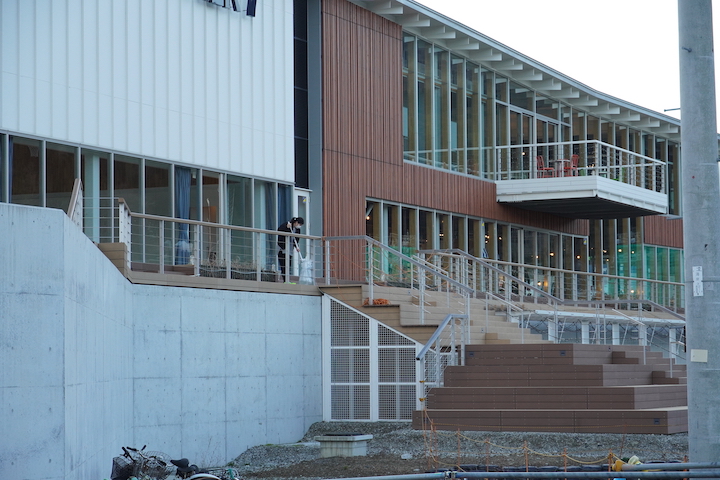 残酷な津波被害にもかかわらず、それでも「海と生きる」と復興スローガンで見得を切った気仙沼の切実な選択は、中心地の入り江でその象徴となるような風景を作り出していた。それは、復興事業として建設される“堅い”防潮堤の上に建つという条件の中で、可愛げのある人懐こいデザインだけが再現できる親密感や安心感によって、再び海との接点を見出していこうとするものだったように感じられる。
