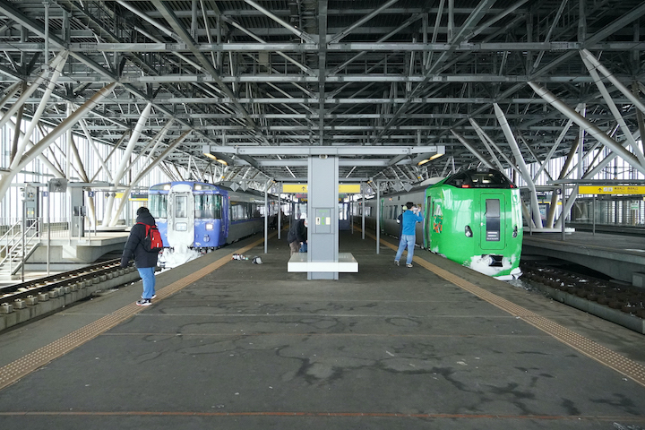 車内のアナウンスとともに、札幌から出発した列車は長く続いた森の区間から一気に旭川のまちへ入っていく。車窓の景色がダイナミックに変わるので、降車の心づもりがいつもごく自然にできている。ただ、これは私が特急列車に乗ったときによく感じることなのだが、アナウンスの「まもなく」は思ったよりも長い。到着を待ちわびる気持ちが募り、住宅が続く景色に焦らされているような気分になったところで、ようやく列車は旭川駅のプラットホームへ入っていく。プラットホームは、メタリックかつモノトーンな質感で実に印象的だ。そして、このプラットホームでの体験が旭川駅を他の駅舎とは一線を画すユニークなものへと仕立てている。