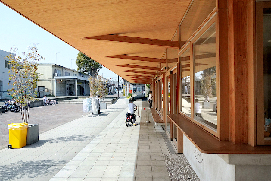 成長期に開発された住宅地の中心に、かつてのスーパーマーケット跡地を再生するかたちで、認知症グループホーム・小規模多機能型居宅介護・就労継続支援・放課後等デイサービスなどが集められた福祉拠点がつくられた。屋根付きの半屋外空間であるロッジアを設けて、複数のケアの場がゆるやかにまとめられている。